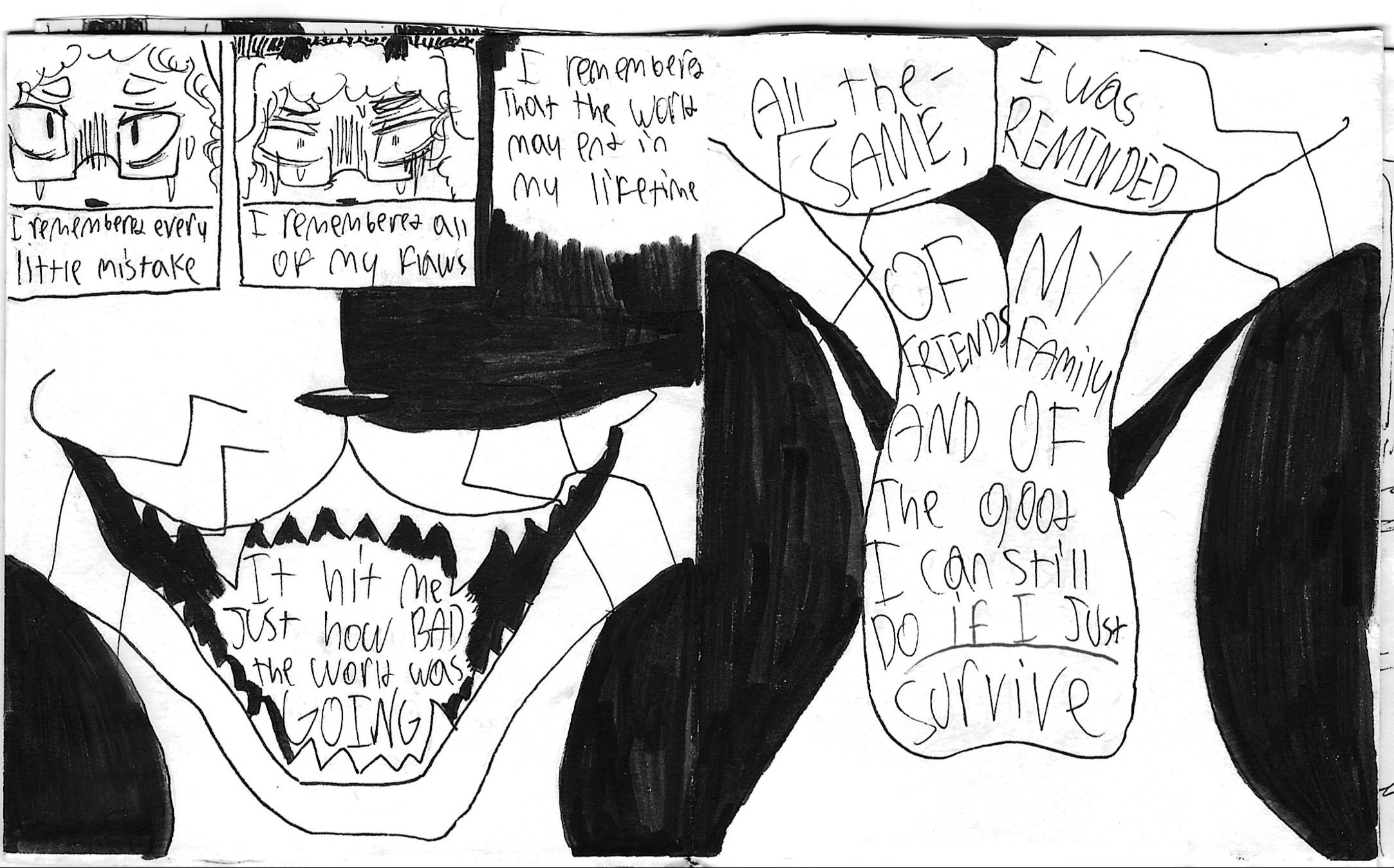 This was my first 8-fold mini zine, written in July 2024. I wrote it when I was in a dark emotional place and that reflects in the work, but it has an ending that I think is happy. I hope you like it.